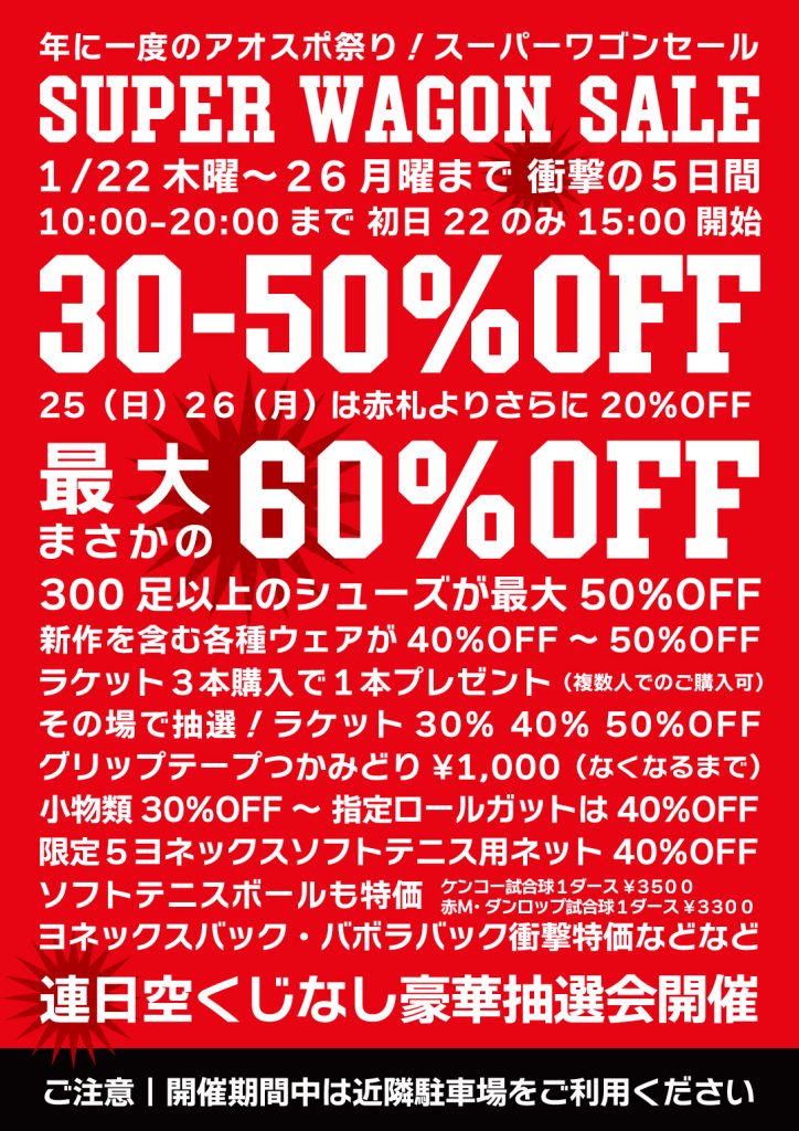 1/22(木)から26(月)まではスーパーワゴンセール!年に一度のアオスポ祭りです!大手チェーン店のセール価格にも全く引けを取らない衝撃価格でお待ちしています!